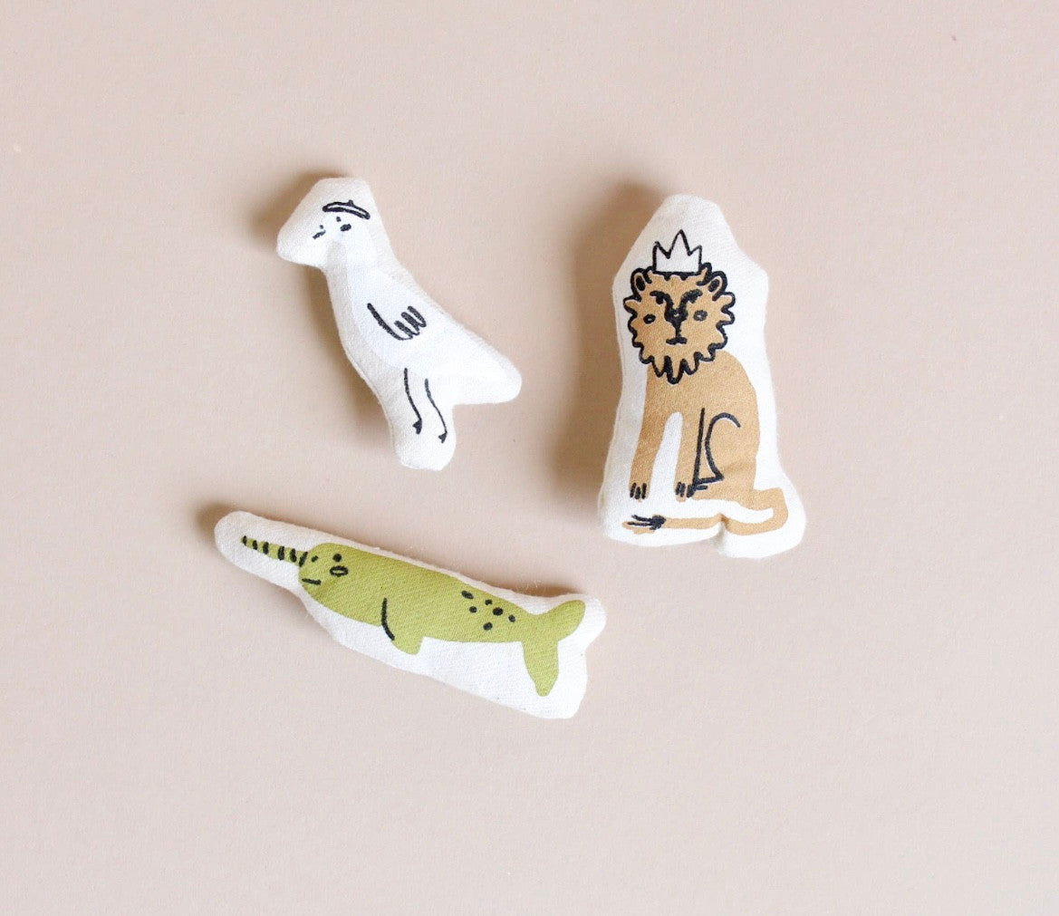 d e t a i l s + natural canvas + castle: 11.7in x 17in - blush, rust and black screen print + goose: 2.2in x 2.5in - white and black screen print + lion: 2.1in x 3in - tan and black screen print + narwhal: 3.6in x 1.5in - chartreuse and black screen print w a s h & c a r e Spot clean recommended. If very dirty, you can place in washing machine on gentle cycle. Reshape and lay flat to dry. Do not put in dryer.