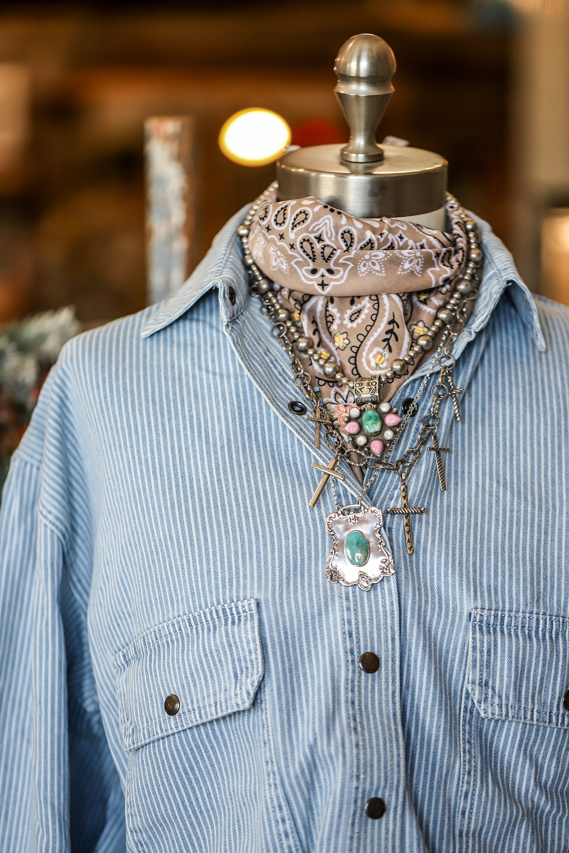 Features: • 80% Cotton, 20% Polyester • Fine pinstripe pattern • Oversized silhouette with dropped shoulders • Flap chest pockets • Tonal button-front closure • Curved hem